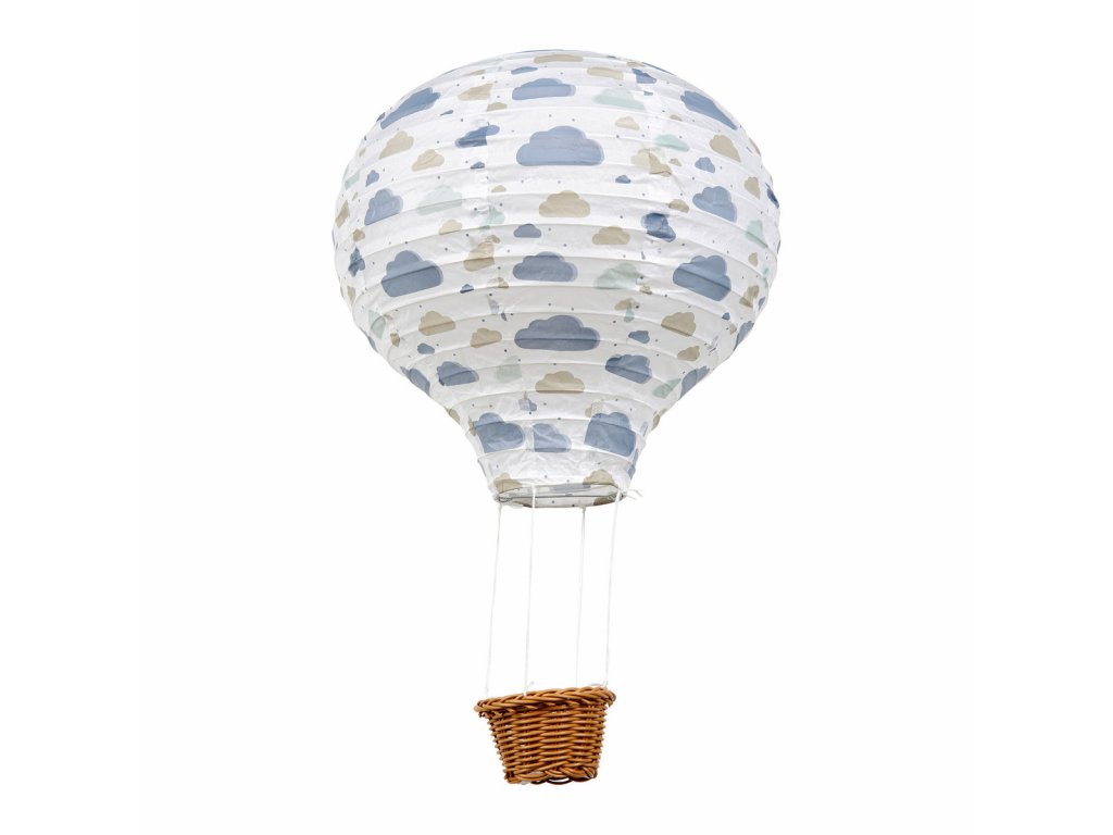Tento úžasný papírový horkovzdušný balón s košíkem z rákosu lze použít jako závěsnou dekoraci nebo jako stínidlo na stropní lampu. Tento model je zdoben různobarevnými mráčky různých velikostí a do košíku si děti můžou postavit svoje oblíbené hračky, které se na ně budou dívat ze shora. Díky svému originálnímu designu bude balón skvělou alternativou klasického stropního svítidla do dětského pokoje, kterou si ihned zamilují všichni malí dobrodruzi.